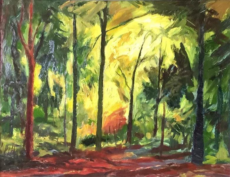 Oil on board of Ethie Woods near Arbroath, part of a joint project with photographer Malcolm Thomson