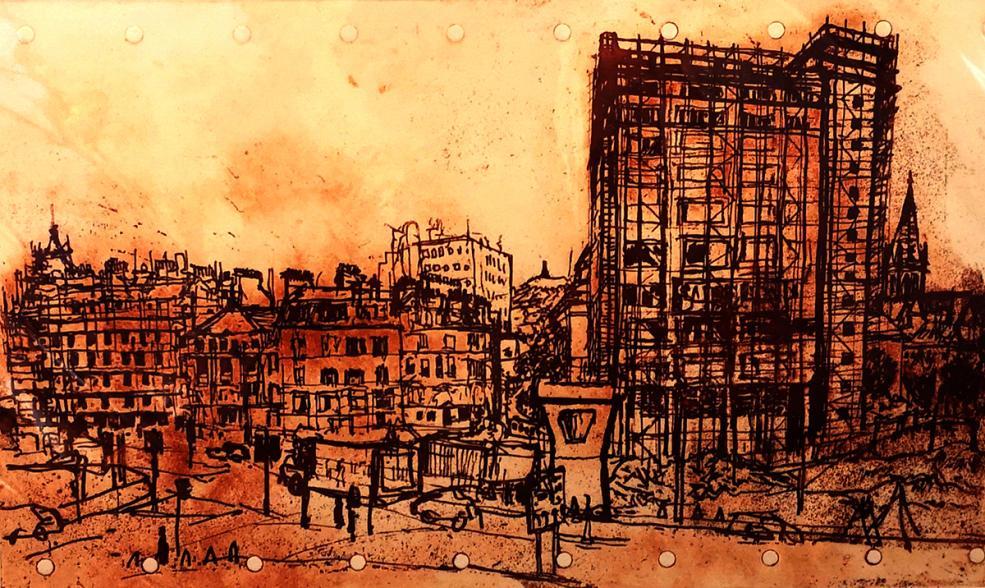 Etching, one of a series portraying the demolition of Tayside House, Dundee